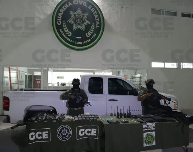 Aseguran armas, droga, vehículos robados y equipo táctico