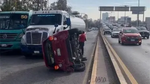 El compacto terminó volcado con las llantas hacia arriba y en sentido contrario. Al sitio arribaron paramédicos, quienes valoraron a los conductores, no ameritando traslado.