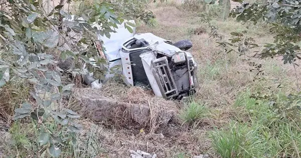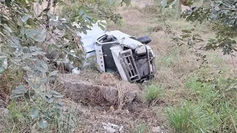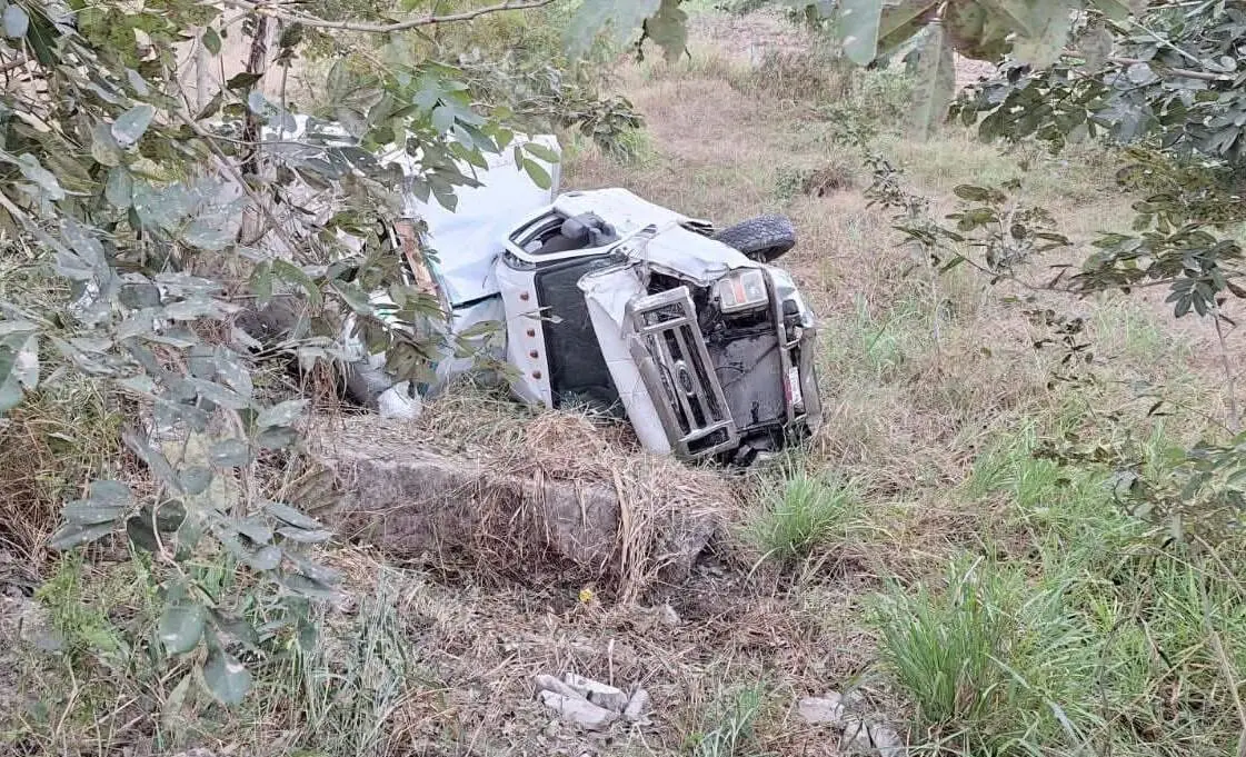 TAMUÍN.- Una camioneta doble rodada se salió del camino y volcó hacia un desnivel en la carretera estatal Tamuín-San Vicente.