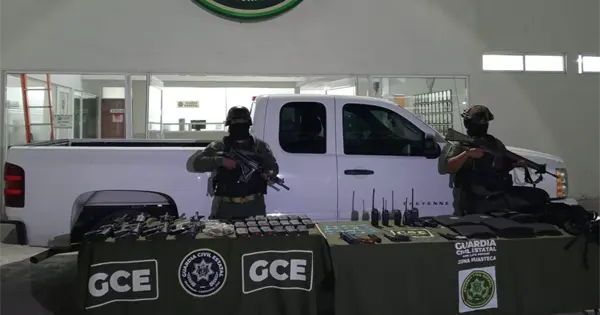 Por ello procedieron a revisarla y en su interior encontraron cuatro armas de fuego largas, tres armas cortas, más de 400 cartuchos útiles, 22 cargadores, 20 dosis de droga, así como equipo táctico y dispositivos de comunicación.