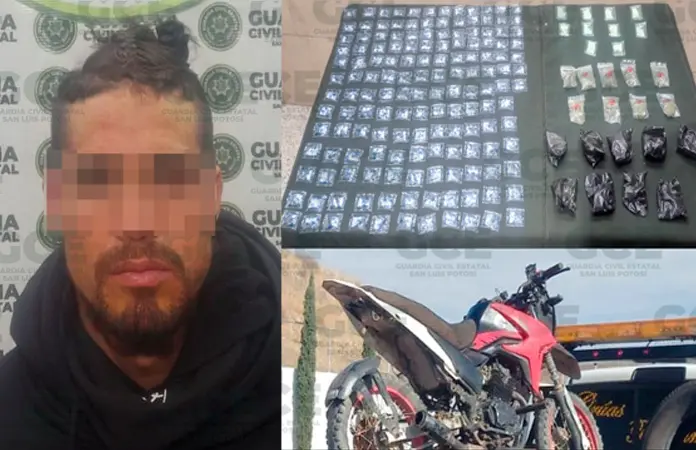 VILLA DE RAMOS.- En labores de inteligencia de la Guardia Civil Estatal, implementadas en la localidad de Dulce Grande, en el municipio de Villa de Ramos, se logró la detención de un supuesto vendedor de droga al que le incautaron más de 170 dosis.