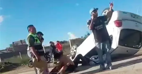 Un automóvil que circulaba a alta velocidad por la carretera a Rioverde, chocó de manera aparatosa contra dos postes de alumbrado público para la luego volcarse quedando con las llantas hacia arriba, por suerte el conductor salió ileso aunque sí se llevó su buen susto.