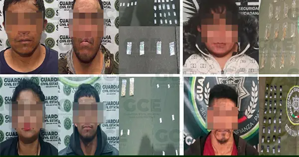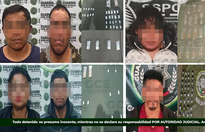 Siete presuntos vendedores de droga, entre los que hay un menor de edad, fueron detenidos por elementos de la Guardia Civil Estatal en distintas zonas del Estado, logrando también el aseguramiento de 143 dosis tanto de cristal como de marihuana, evitando que llegaran a la población potosina.