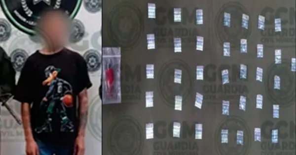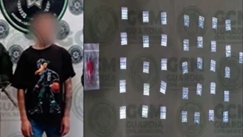 Después aplicar el protocolo de actuación, le encontraron 36 dosis de una sustancia con características de la metanfetamina conocida como cocaína, al mismo tiempo se consultó su estatus legal en Plataforma México, donde se confirmó que se trata de un objetivo prioritario generador de incidencias delictivas, con ocho arrestos por delitos del fuero común y dos órdenes de aprehensión vigentes.
