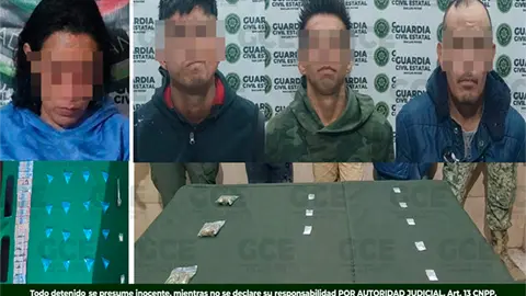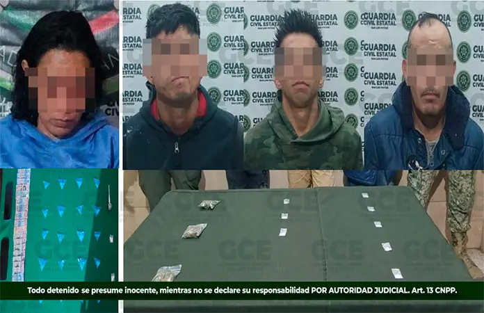 En otra acción, en la colonia Morales de la capital potosina, los elementos de la GCE detuvieron a Israel "N", de 45 años; Aarón "N", de 32 años, y Pedro "N", de 29 años, a quienes se les aseguraron bolsas con presunta marihuana y dosis de "cristal", por lo que fueron puestos a disposición de la autoridad competente, quien determinará su situación jurídica conforme a derecho.