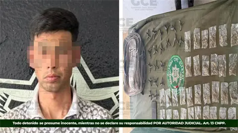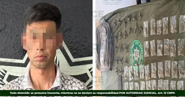 La Guardia Civil Estatal detuvo a Francisco Isaí "N", de 24 años, en el municipio de Villa de Guadalupe, por su probable responsabilidad en delitos contra la salud y portación de objetos prohibidos.