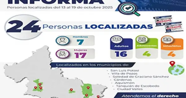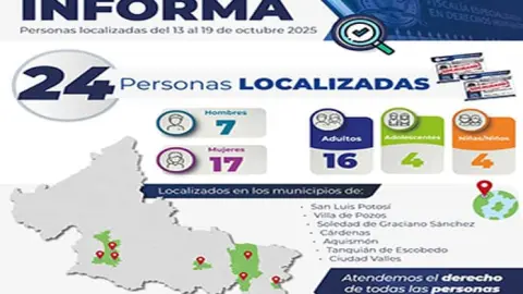 Gracias a esta colaboración interinstitucional y al apoyo de la ciudadanía, las 17 mujeres y 7 hombres fueron ubicados en los municipios de Villa de Pozos, Soledad, Cárdenas, Aquismón, Tanquián de Escobedo, Ciudad Valles y la capital del estado. En entrevista, manifestaron que su ausencia se debió a motivos personales y que no fueron víctimas de la comisión de un delito.