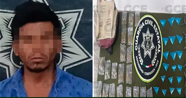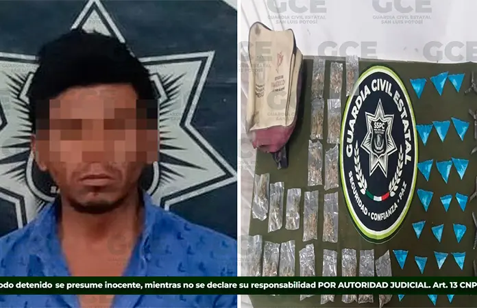 En el municipio de San Vicente, en la Zona Huasteca, agentes de la Guardia Civil Estatal detuvieron a un sujeto de 38 años de edad, a quien se le relaciona con presunta incidencia delictiva en la región y se le decomisaron múltiples dosis de drogas y artefactos "ponchallantas".
