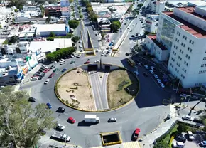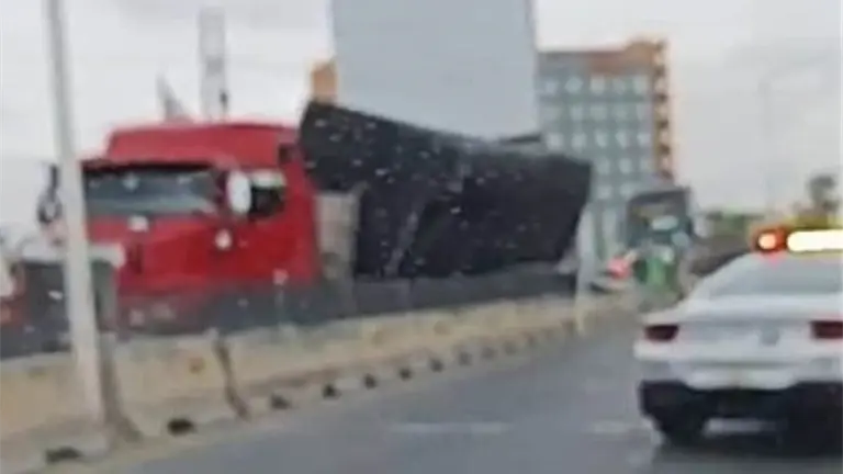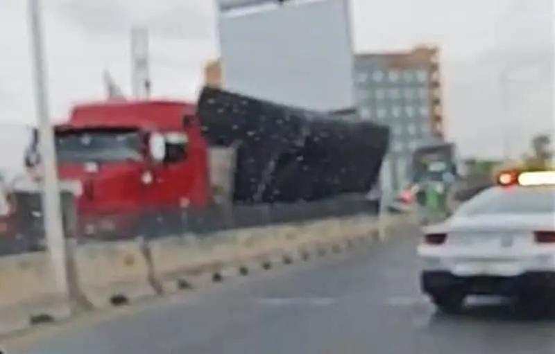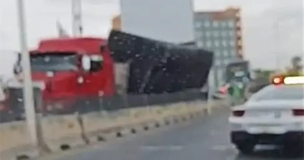 La caja de un tráiler se desprendió y quedó recargada sobre el muro de contención en la glorieta del Real Inn, al poniente de la capital potosina, en la salida con dirección a la zona centro.