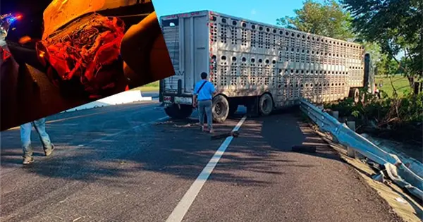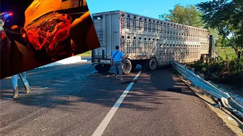 La madrugada de este sábado, el chofer de un tráiler con remolque tipo jaula ganadera ocasionó un aparatoso accidente, en el kilómetro 118 de la carretera de cuota Valles-Tamuín, cerca del entronque con la carretera libre.