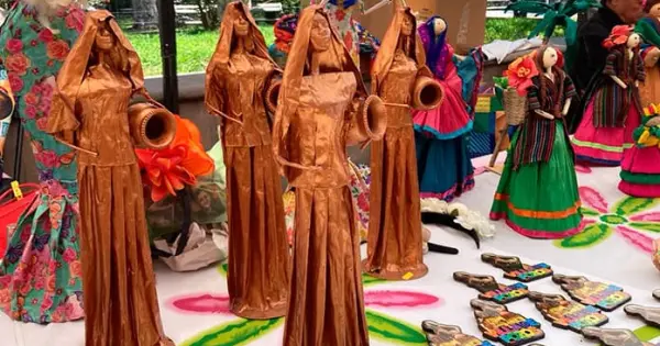 Artesanas de Villa de Pozos mostraron algunas de las figuras hechas en papel maché que tiene disponibles para su adquisición en los puestos colocados en el jardín principal de la cabecera municipal. Entre dichas figuras, La Aguadora, escultura ya representativa del nuevo municipio.