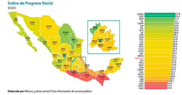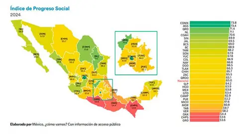 Pese a un ligero incremento anual, durante 2024, el estado de San Luis Potosí registró un Índice de Progreso Social (IPS) de 64.2 puntos, cifra que lo coloca justo debajo del promedio nacional con focos rojos de desempeño en materia de agua y saneamiento, vivienda, acceso a la información y comunicaciones, oportunidades y libertad personal y de elección, de acuerdo con la información de la organización México ¿Cómo Vamos?