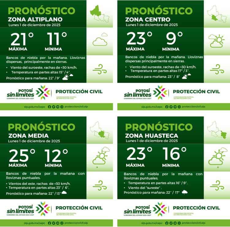 De acuerdo con el pronóstico, la zona centro alcanzará máximas de 23°C y mínimas de hasta 9°C, mientras que en el Altiplano se prevén amaneceres de 11°C con posibilidad de heladas. En la Huasteca, pese a un clima más cálido, las máximas rondarán los 27°C.