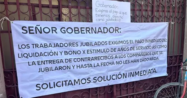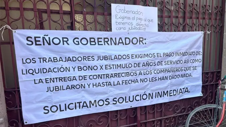 Durante la protesta, los inconformes colocaron una manta dirigida al gobernador en la que demandan el pago inmediato de liquidaciones, bonos por estímulo de años de servicio, así como la entrega de contrarrecibos a compañeros que, aseguran, se jubilaron y hasta ahora no han recibido ningún recurso.