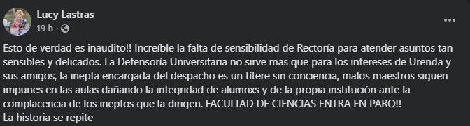 A través de redes sociales, calificó como "inaudita" la actuación institucional ante un tema que consideró sensible y delicado. También cuestionó el papel de la Defensoría Universitaria y sostuvo que existen docentes que permanecen en las aulas pese a señalamientos, lo que —afirmó— afecta la integridad de estudiantes y la imagen de la institución.