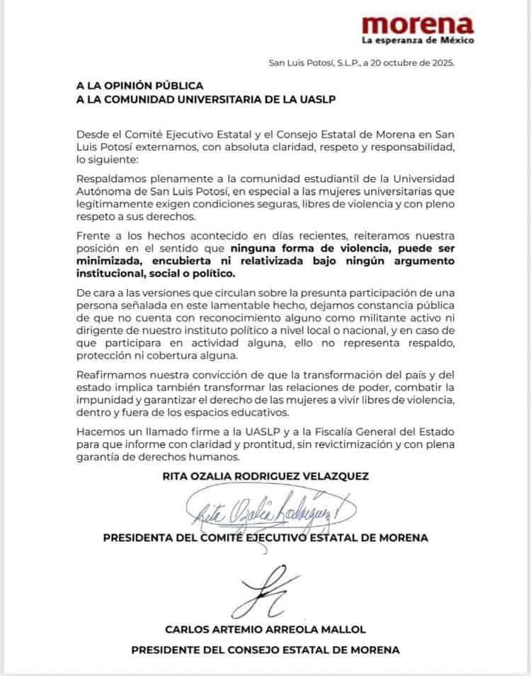 El Comité Ejecutivo Estatal y el Consejo Estatal de Morena en San Luis Potosí se deslindaron públicamente de la persona presuntamente implicada en el caso de violación denunciado en la Facultad de Derecho de la Universidad Autónoma de San Luis Potosí (UASLP), aclarando que no cuenta con reconocimiento alguno como militante ni dirigente del partido.