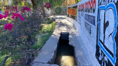 Descubre cómo las personas transitan a pie sobre el bulevar Río Españita con presencia de agua negra en un hueco.