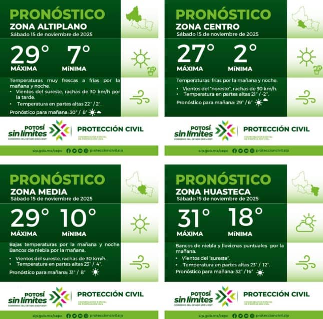 La Coordinación Estatal de Protección Civil informó sobre el ingreso del frente frío número 14, el cual provocará un notable descenso de temperaturas en las próximas horas. Según el pronóstico, las temperaturas máximas alcanzarán los 27 grados en la zona centro y los 31 grados en la huasteca, mientras que durante la noche y madrugada se espera un descenso importante, con mínimas de hasta 2 grados en la zona centro y 7 grados en el altiplano, donde existe probabilidad de heladas.