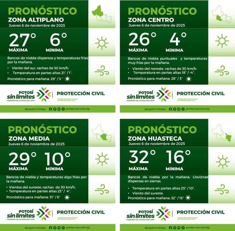 De acuerdo con el pronóstico, las temperaturas máximas alcanzarán los 26 °C en la zona centro y hasta 32 °C en la Huasteca, mientras que durante la madrugada se esperan valores cercanos a cero en las partes altas del estado.