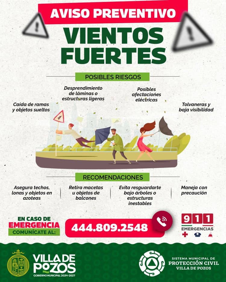 La Dirección General de Protección Civil de Villa de Pozos emitió un aviso preventivo ante la presencia de vientos fuertes que podrían alcanzar rachas de entre 40 y 60 kilómetros por hora en las próximas horas.
