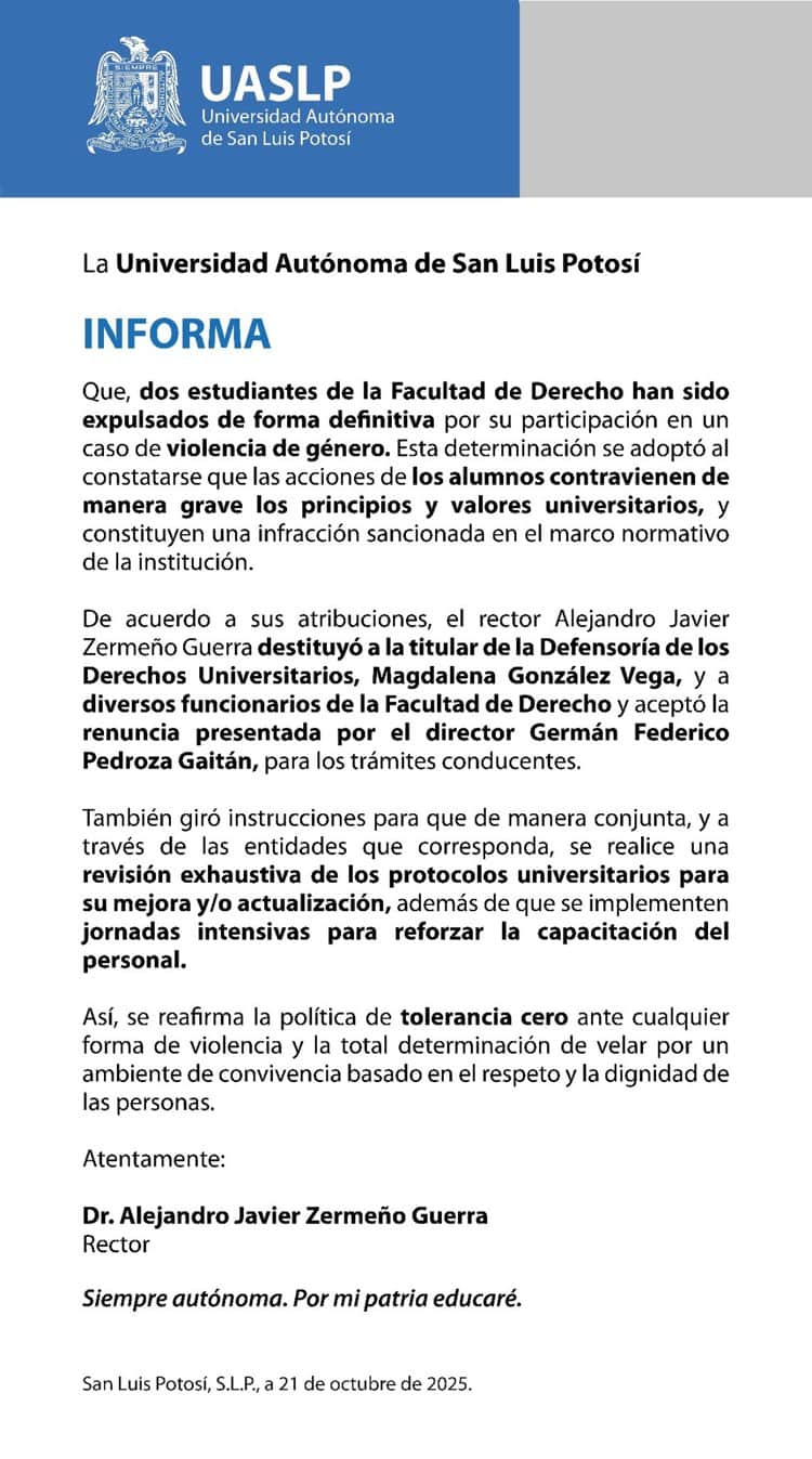 Además, "aceptó la renuncia presentada por el director Germán Federico Pedroza Gaitán, para los trámites conducentes. También giró instrucciones para que de manera conjunta, y a través de las entidades que corresponda, se realice una revisión exhaustiva de los protocolos universitarios para su mejora y/o actualización, además de que se implementen jornadas intensivas para reforzar la capacitación del personal".