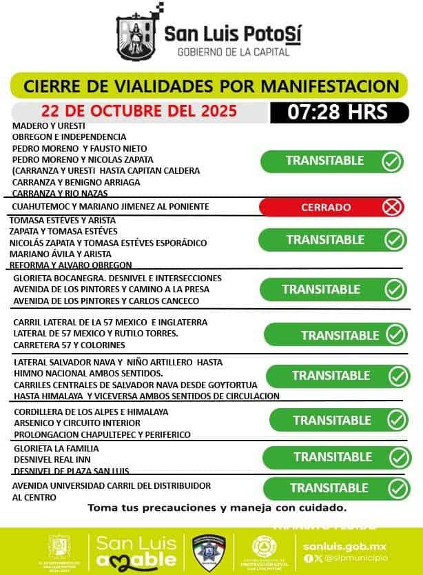De acuerdo con el reporte emitido a las 07:28 horas, únicamente permanece cerrado el tramo de Cuauhtémoc y Mariano Jiménez, justo en la esquina de la Facultad de Derecho de la UASLP. El resto de las rutas se encuentra transitable, luego de que las movilizaciones estudiantiles paralizaran buena parte de la capital durante el lunes y martes.